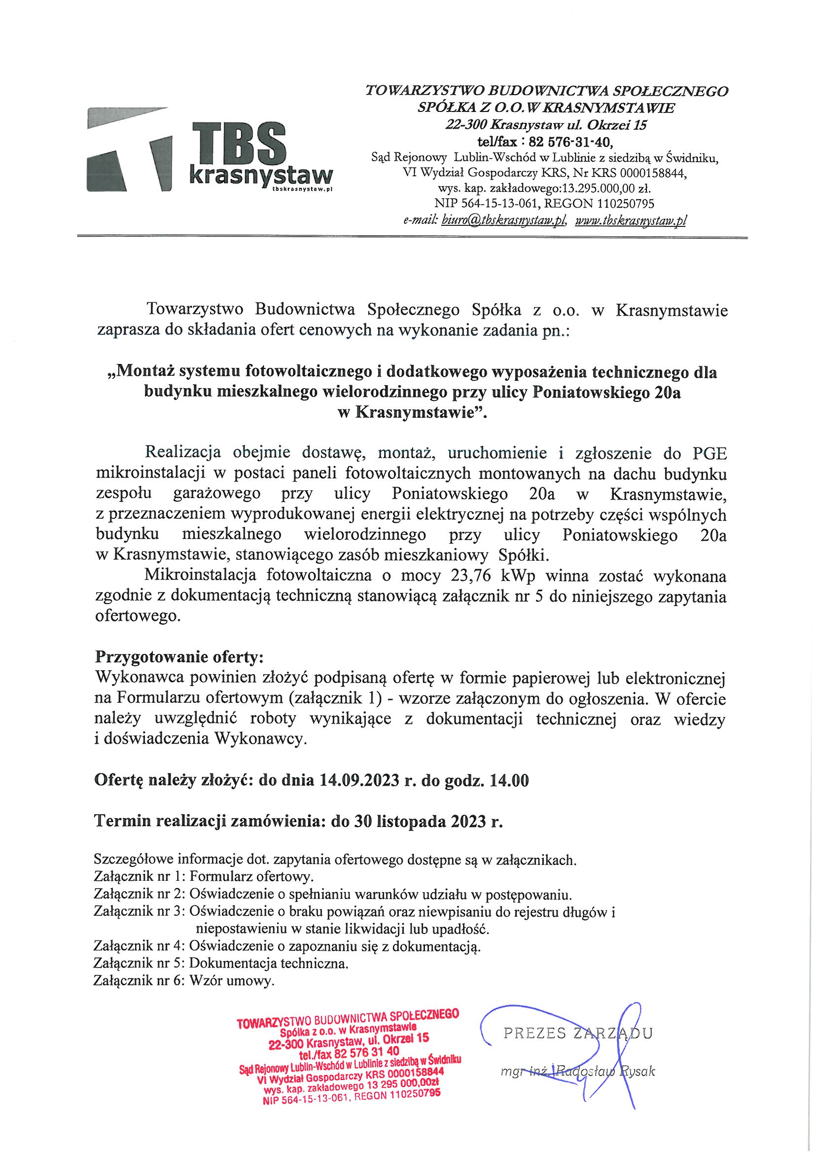 Zaproszenie do złożenia ofert w postępowaniu „Montaż systemu fotowoltaicznego i dodatkowego wyposażenia technicznego dla budynku mieszkalnego wielorodzinnego przy ulicy Poniatowskiego 20a w Krasnymstawie”